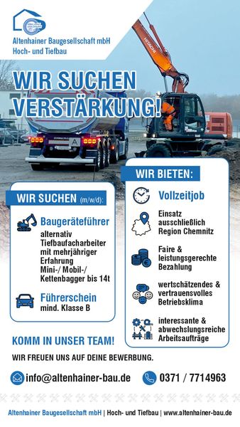 Seit 1996 steht die Altenhainer Baugesellschaft mbH für solide Bauleistungen im Hoch- und Tiefbau. Als eigentümergeführter Familienbetrieb werden öffentliche, gewerbliche und private Projekte in der Region Chemnitz zuverlässig umgesetzt. Klare Abläufe, saubere Arbeit und feste Ansprechpartner sorgen für Sicherheit in jeder Bauphase.
